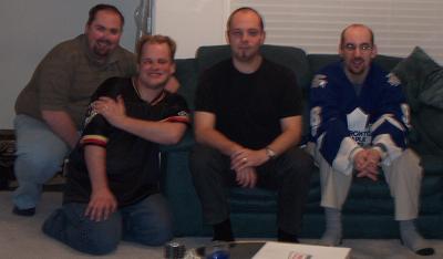 I was supposed to post this picture last March when it was taken and it totally slipped my mind until I saw it tonight while sifting through some photos. Unfortunately the quality ended up being poor, which sucked, because it’s not too often this gang is in the same room. The four of us (in order) – Rob, myself, Kip, and Brent – were best friends through most of high school but had, of course, drifted away with time. Brent had gone to school in Thunder Bay and then moved to Moncton, Kip had gone to Guelph, and Rob and I had originally moved to Toronto before settling back in Bolton. Brent had taken a trip out here last March/April and I’d managed to get the gang back togther for an evening of Krispy Kreme and Russ Meyer flicks. :) I’ll do my best to get some old photos of us this coming week, but for now, here’s the gang, circa-March 2002.